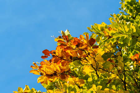 Autumn tree leaves on blue sky background