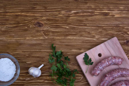 sausages, parsley on wooden background