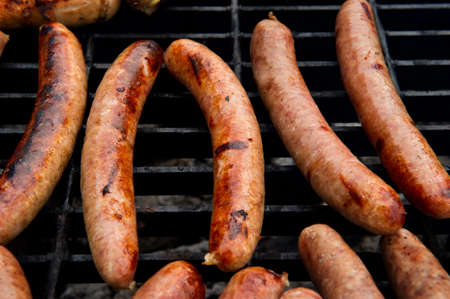 Sausages grilled on a charcoal barbeque. Top view of tasty barbecue, food concept, food on grill and detail of sausages on the grill