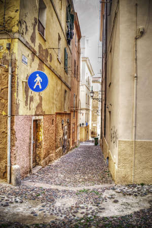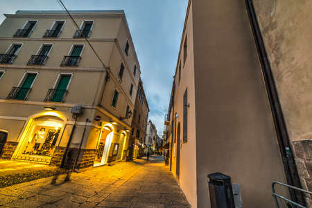 Narrow street in Alghero old town at sunset. Sardinia, Italy