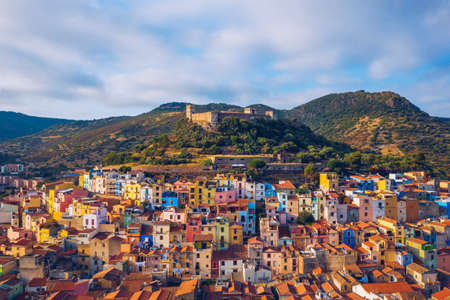 Aerial view of the beautiful village of Bosa with colored houses and a medieval castle. Bosa is located in the north-wesh of Sardinia, Italy. Aerial view of colorful houses in Bosa village, Sardegna.