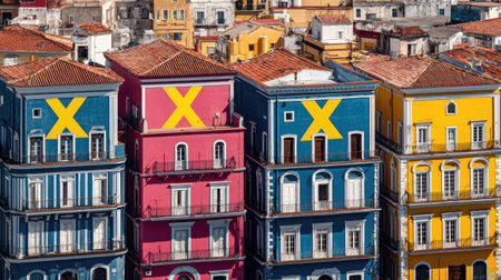 Rows of vibrantly painted buildings showcase an architectural style. The facades feature symmetrical arrangements of windows and balconies, enhanced by rooftop textures. Bold symbols adorn the structures, contrasting with the colors. The setting suggests an outdoor environment, with opportunities for various commercial and illustrative applications.