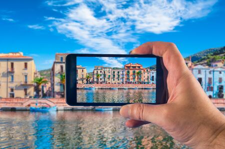 Hand taking picture with a smartphone in the village of Bosa, in Sardinia, in summer