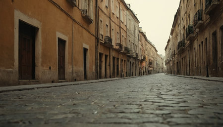 A low-angle view of a cobblestone street with old buildings and arched doorways illuminated by warm sunlight.