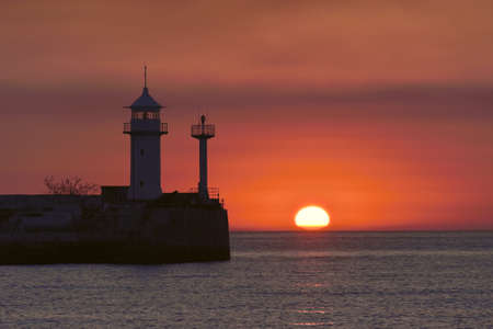 The sun rises from the horizon above the surface of the Black sea in Yalta. Lighthouse marine station, bright red sky at dawn, no people, a place for text. Russia, Crimea, 2019