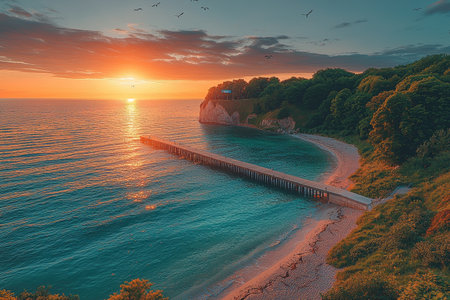 Beautiful view of the pier at sunset on Walantiago beach in Germany, near a testing center and Grangyborf travel agency with its sign above it, calm sea, white sand beach, a long concrete jetty leading into clear blue water, birds flying overhead, golden sunlight reflecting off ocean waves, serene atmosphere, picturesque landscape, shot from a drone, wide-angle lens. --chaos 30 --ar 3:2 --quality 2 --stylize 500 --v 6.1 Job ID: 305e004d-4ce6-4b2a-b7ba-b49166c4099b