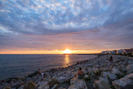 Sochi, Russia-June 09, 2018: Seascape with beach and pier. People rest on the rocky shore.