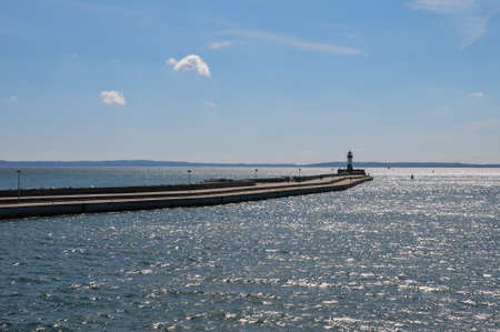 Lighthouse tower on stony concrete mole in Sasssnitz town port, Ruegen island, Germany. Lighthouse at the harbour entrance in Sassnitz.