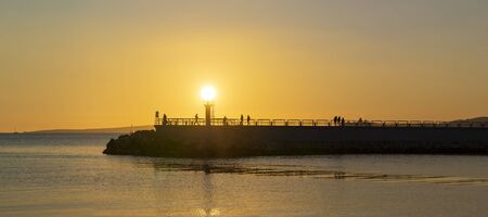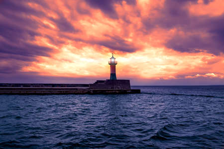 Sunset over the harbor entrance in Warnem?nde on the Baltic Sea. Concept: travel and vacation