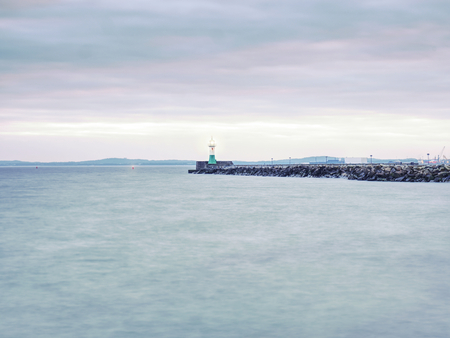 Shinning lighthouse at the end of stony pier. Cloudy eveningafter rainy day, Sassnitz, Germany