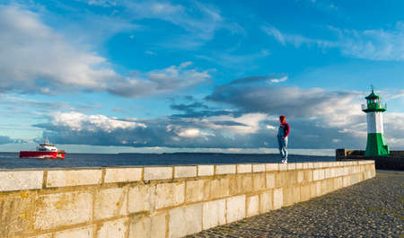 Beautiful landscape on the Rugen island in the Baltic Sea on the pier with a lighthouse and sailing ship in the background. Young redhead woman walking the pier and looking at the horizon