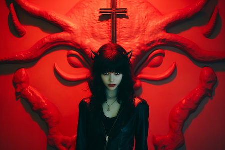 A devil with horns on his head is standing in front of a background. The man has a demonic appearance and is wearing a black jacket