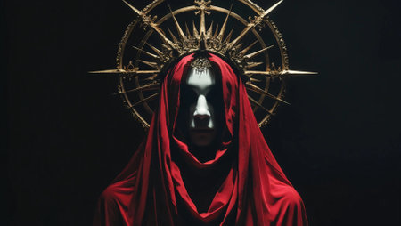 A mysterious, eerie figure draped in a deep red veil, with a face partially obscured by black fabric. The golden crown is adorned with jagged, spiked thorns, giving a regal yet ominous presence. The background is dark, emphasizing the contrast between the rich colors and the haunting expression. The composition evokes themes of gothic mysticism, divine power, and hidden truths.