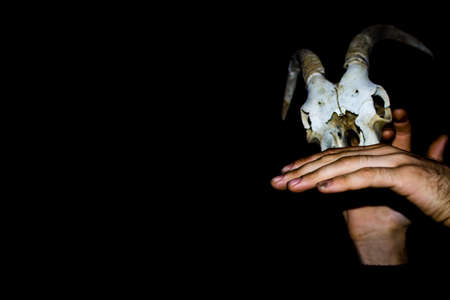 a witch holds in hands the skull of a demon. Halloween, a young woman at the carnival like a witch,