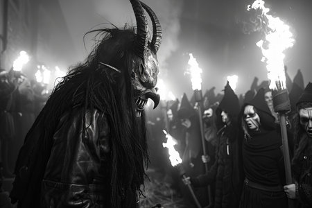 a man in a full costume and mask, adorned with horns, stands amidst a dark and foreboding landscape. the image captures the essence of deathcore with its subtle tonal values and necropunk aesthetic. inspired by norwegian nature, the contrasting dark black and light beige colors add to the overall mysterious and captivating atmosphere. ai generated