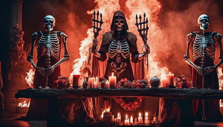 A dark ritual scene with skeletons and a hooded figure holding tridents, surrounded by candles and fire, in a gothic setting. AI Generation