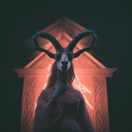 a photo featuring a dark and eerie aesthetic with elements of witchcraft, a black goat, and the satanic symbol baphomet. the pastel color scheme adds a unique twist to the 1970s horror aesthetic, with dominant dark, red, and ivory tones. the image, captured in 32k uhd using fujifilm velvia 100, showcases a bizarrecore and weirdcore style, with intricate world design and blink-and-you-miss-it details. this macabre