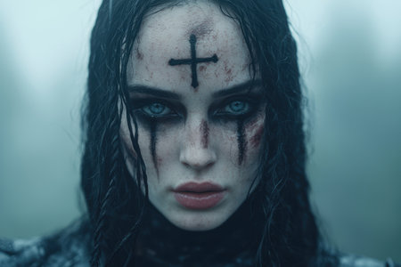 Intense gaze of a dark-haired woman with a cross symbol on her forehead