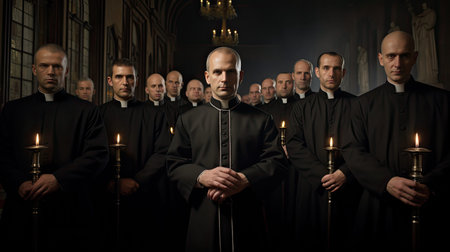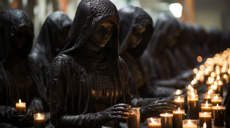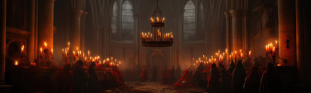 Mysterious Ritual in a Dimly Lit Hall with Hooded Figures. Concept Mysterious Ritual, Dimly Lit Hall, Hooded Figures