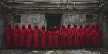 A mesmerizing scene of people in vibrant red cloaks with hoods, gathered in a mysterious and enigmatic setting. The dramatic atmosphere, rich in symbolism, evokes a sense of secrecy and intrigue