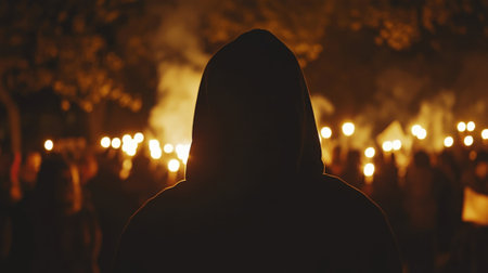 Hooded protestor witnessing night demonstration with torches and smoke