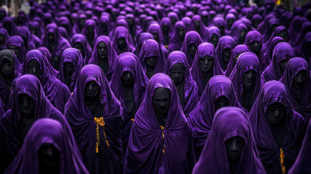 A striking image showcasing a sea of dark figures clad in flowing purple cloaks, embodying mystery and unity during a cultural event that evokes deep emotions.