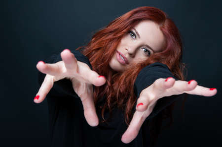 Angry and crazy brunette witch casting a spell and shouting, creepy horror, witchcraft and halloween concept