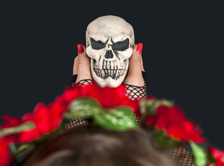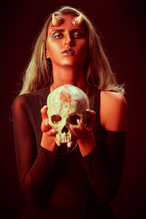 Portrait of a scary and attractive devil girl, dressed in black sexy lingerie, holding a human skull. Black studio background. Halloween. Thriller, horror.