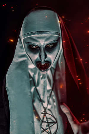 Close-up portrait of a devilish scary nun with bloody teeth surrounded by sparks of hellfire. Halloween and Horrors.