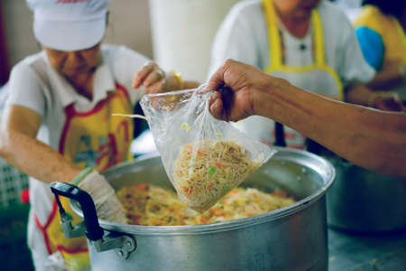 Hands of volunteers serves free food to the poor and needy in the city : The poor people bring a container to scoop food to eat and relieve hunger and bring home