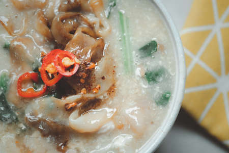 Thai style rice congee or rice porridge with ingredient condiments. (Fish sauce,fried garlic,chilli,pepper, spring onion, coriander and lime).