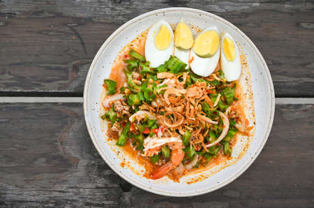 Thai spicy food with Vermicelli on wood floors.