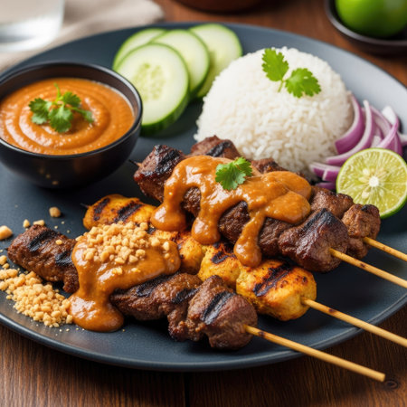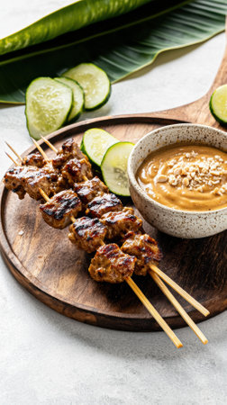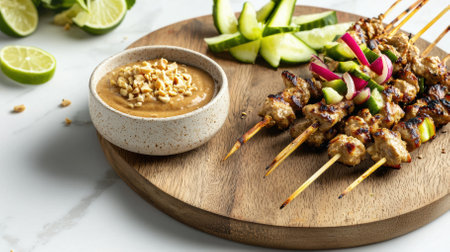 Close-up of succulent grilled satay skewers resting on a rustic wooden plate, paired with creamy peanut sauce, lime wedges, and cucumber slices. Soft lighting highlights the textures.