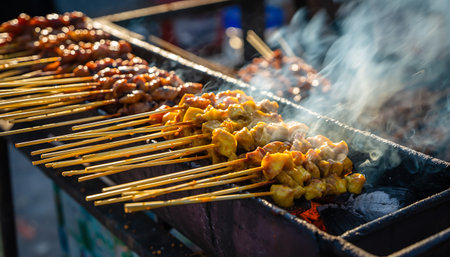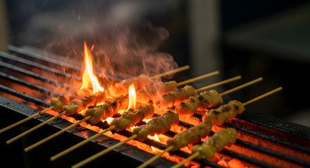 Delicious satay skewers grilling on flaming charcoal grill in street food market