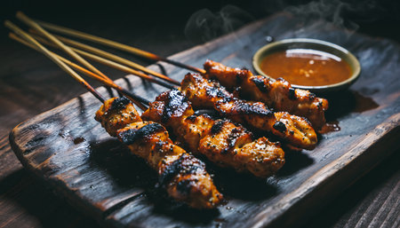 Delicious grilled chicken satay skewers served with peanut sauce on a rustic wooden board, perfect for a tasty appetizer or snack.