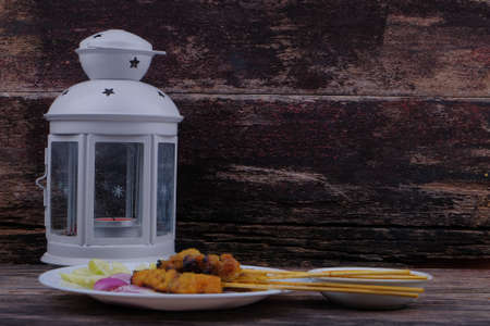Satay is skewered meat on a bamboo stick then grilled on charcoal fire eaten with peanut gravy. Satay is a famous street food in South East Asia. Selective focus
