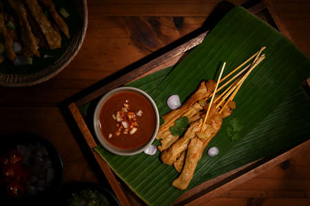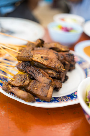 Thai appetizer, liver pork in bamboo skewers eaten with peanut sauce or sweet and sour sauce. Asian food concept style and Thai food