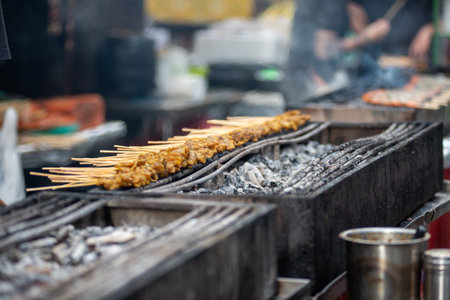 Meat skewers cook over hot coals in Satay Street food market. tasty satay
