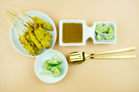 Pork satay skewer with peanut sauce and cucumber sauce, onion, chili Thai style food