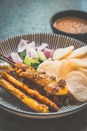 Chicken satay with delicious peanut sauce, onion and cucumber on wooden table