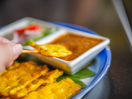 Closeup of pork satay with peanut sauce and woman 's hand.
