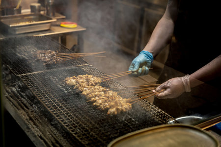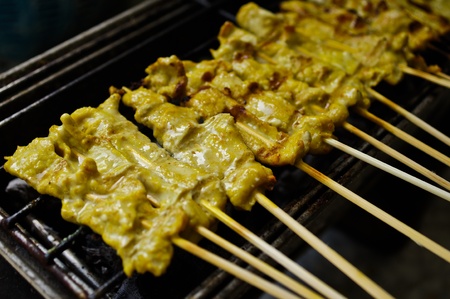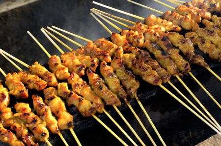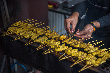 Grilling chicken satay, asian cuisine