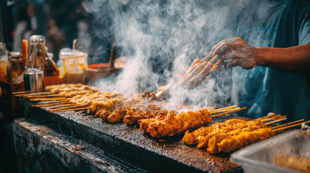 An inviting scene of a street food stall where a chef skillfully grills skewers over an open flame, surrounded by aromatic smoke.