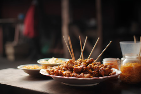 Grilled Chicken Satay Skewers with Peanut Sauce and Pickled Vegetables in Warm Asian Restaurant Setting