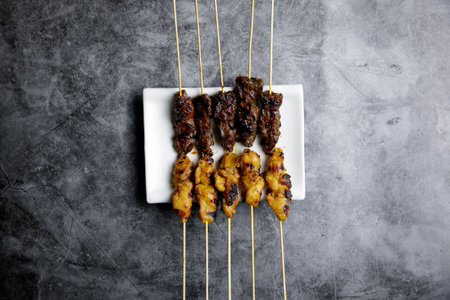 Flat lay of Malaysian chicken, beef and mutton satay. One of the famous dish in Malaysia