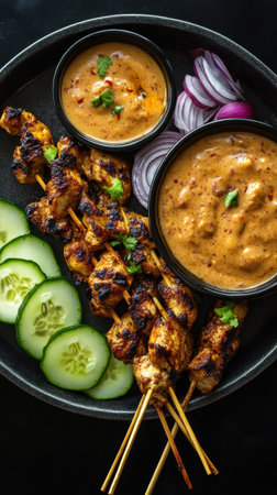Experience the rich flavors of grilled chicken skewers served with creamy peanut sauce and fresh vegetables, perfect for savory delights and culinary adventures.