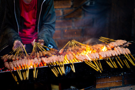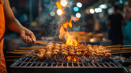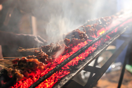 Roasting meat, chicken and mutton satays with charcoal, fire and smoke at night market in Jakarta, Indonesia.
