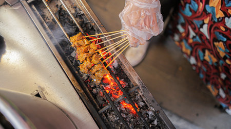 close up of hand with traditional chicken satay skewer in charcoal grill
