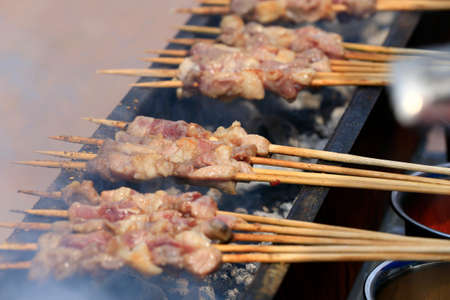 Grilled pork Satay grilling on stove. Row of barbecue pork roast grill or satay roast pork, Thai style street food.