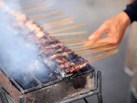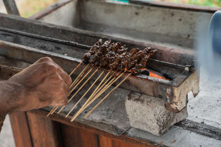 The process of making Indonesian chicken satay in traditional way using charcoal, tasty Asian cuisine.